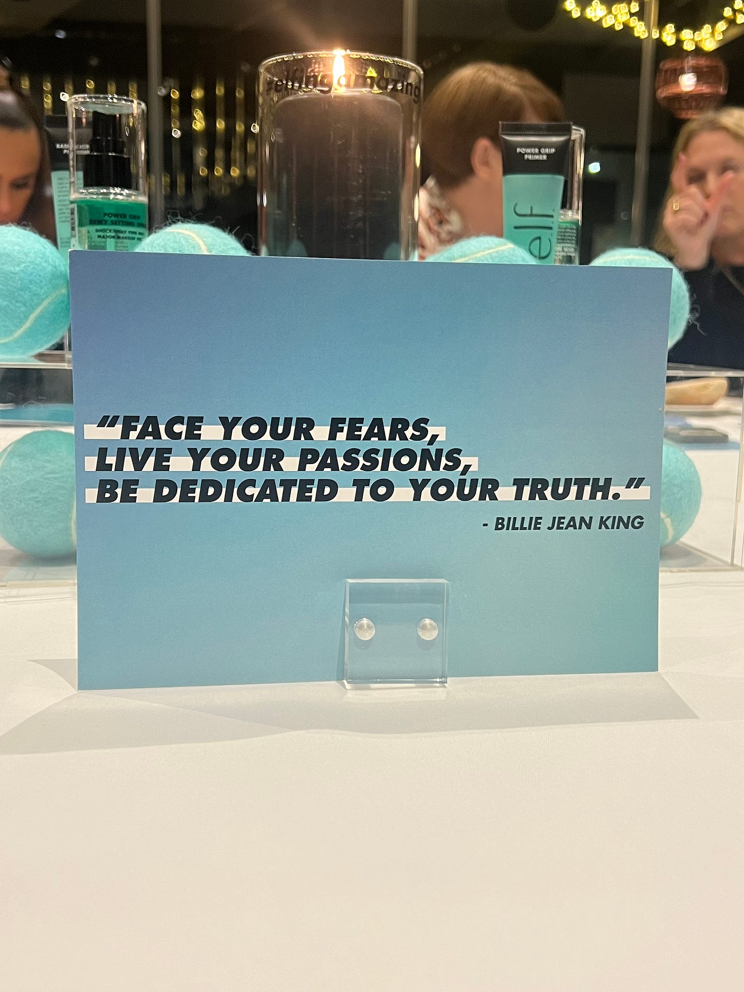 When I met Billie, she and another The Beauty Ed. icon, Kory Marchisotto - the CMO of e.l.f Beauty played a game: “Serving Facts: Change the Board ” where armed with her tennis racket , Billie smashed some balls printed with statistics about gender inequality into the audience.